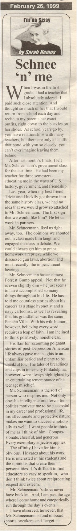 You don't remember me (and I don't expect you to). My name is Aileen Walters (now Aileen Smith). You were my government teach back in 2003-2004. I wanted to thank you for teaching me as much as you did while I was in your class. I have used what I learned from you in a very big way; and I wanted to share that with you. Three years ago, I was in a high speed car crash with a drunk driver that resulted in the death of my first born son, Dimitri. My husband and I were driving from our current home in Colorado Springs, back to San Diego for the baby shower, and were hit in New Mexico; which had the worst DWI laws in the country... I say had, because I used my knowledge gained from your class to help change the DWI laws in all major counties in New Mexico. If you'd like, give Justice for Dimitri a Google and you'll find the two year campaign that I paved along with the governors office to help see Dimitri's Law save lives. Now that the campaign is over, I thought I would start to reflect on people in my pay that helped me build tools that I used for making Dimitri's Law possible. I never would have thought to make a tragedy in my life into something bigger than myself - I never would have thought to contact the governor's aide- or campaign as I did. Thank you.. You changed my life, and through that helped save the lives of many. Aileen Sent from my iPhone